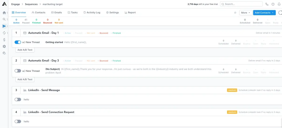 As you use Apollo to hone your ideal customer profiles, create sequences using these steps to match each type of outbound and/or inbound prospect with automatic and manual messages, LinkedIn engagement, calls, and action items that speak directly to the value propositions they want.