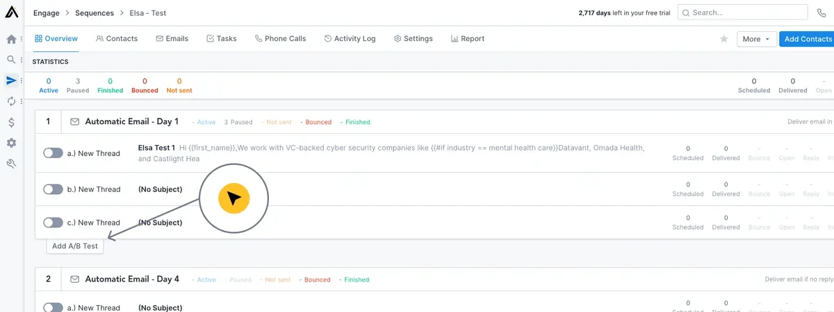 Navigate to the sequence you want to test and click "Add A/B Test."