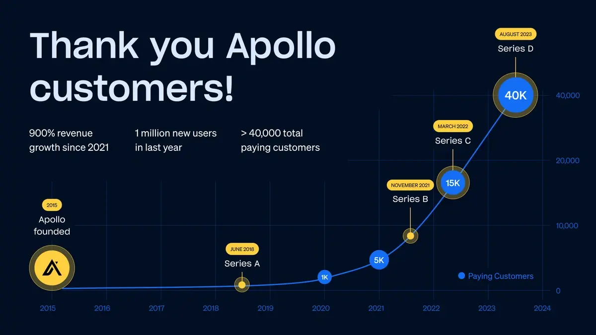 Over the years, the team and I have been hard at work, building everything in-house and from the ground up. We expanded Apollo.io’s B2B database, built new sales execution solutions on the platform, grew our team, and onboarded millions of new users around the world.