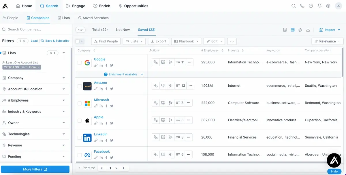 When you use Apollo, list building is simple. We provide advanced filters which highly granular data points like names and titles, company revenue, location, technologies used, job postings, keywords, and so much more!